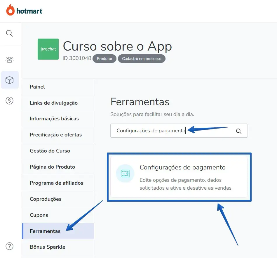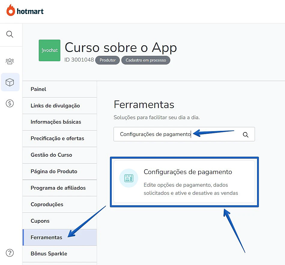 Clique no menu "Ferramentas" -> Realize uma pesquisa por "Configurações de pagamento" e selecione essa opção: