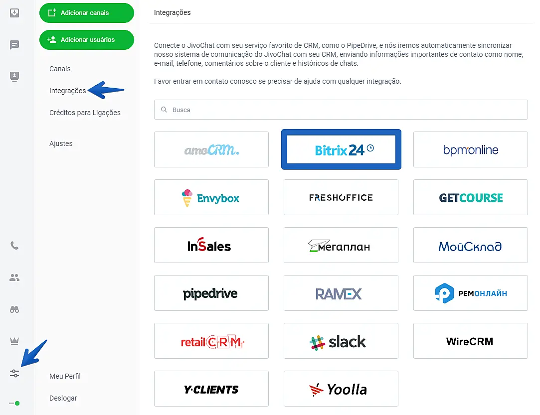 Depois, abra o aplicativo web do JivoChat ou o aplicativo para Desktop, acesse as Configurações -> Integrações -> e clique em Bitrix24.