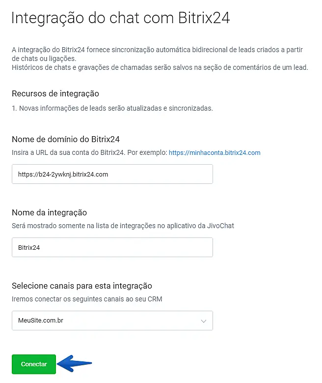 A integração do Bitrix24 fornece a criação automática de leads e salva históricos de chats e ligações dentro do CRM.
