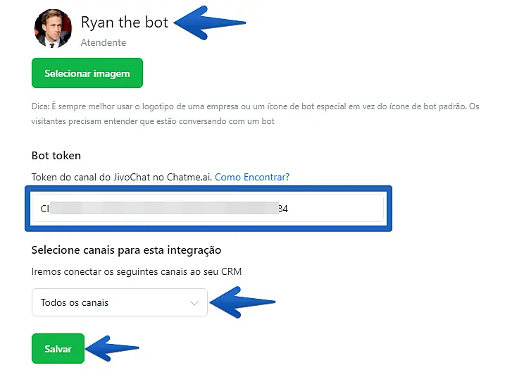 Insira o nome do bot, carregue uma imagem para seu bot e selecione em quais canais o bot será aplicado. Quando tudo estiver pronto, clique em Salvar: