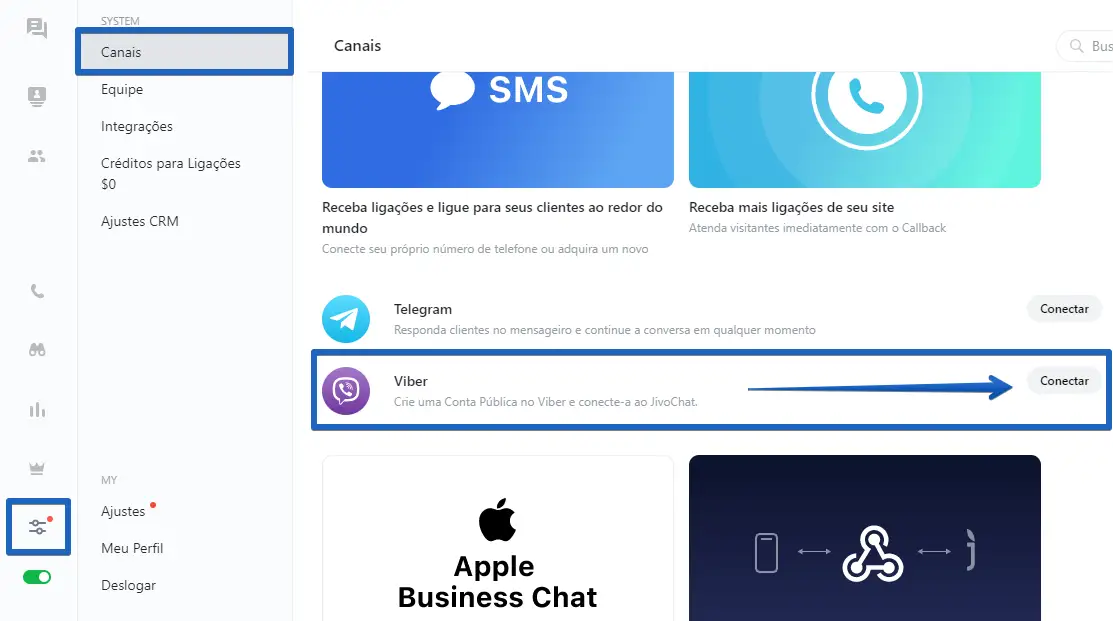 Agora abra o aplicativo JivoChat e vá em "Configurações" -> "Canais", encontre "Viber" na lista de canais sugeridos e clique em "Conectar".