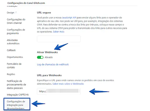 Em seguida, vá em Configurações de integração para desenvolvedores -> Ative os Webhooks -> Cole a URL que você copiou no passo 2 deste tutorial.