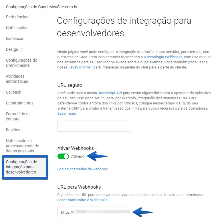 6. Em seguida, acesse o menu "Configurações de integração para desenvolvedores", ative os Webhooks e insira a URL da AGIDESK (que você copiou nos passos acima) no campo "URL para Webhooks".