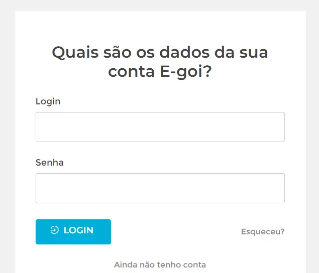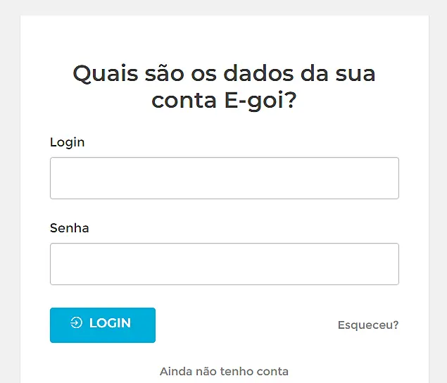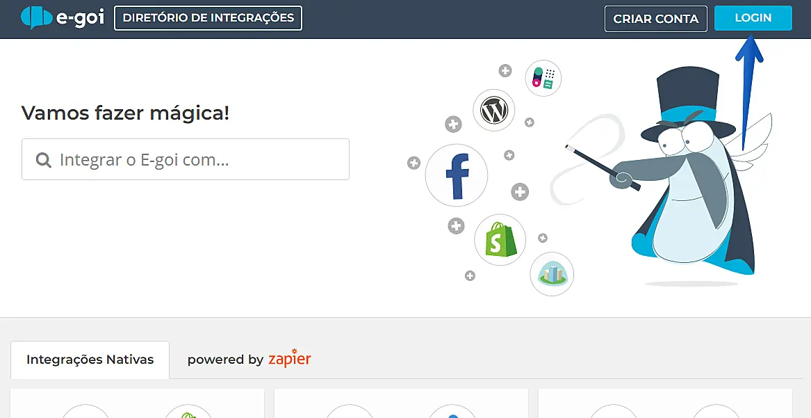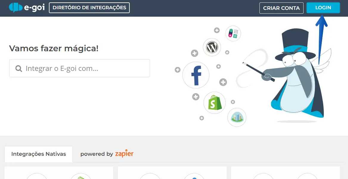 É muito simples! Acesse sua conta E-goi, com seu email e senha de cadastro. Também pode entrar através do menu do canto superior direito da sua conta e clicando em Integrações.
