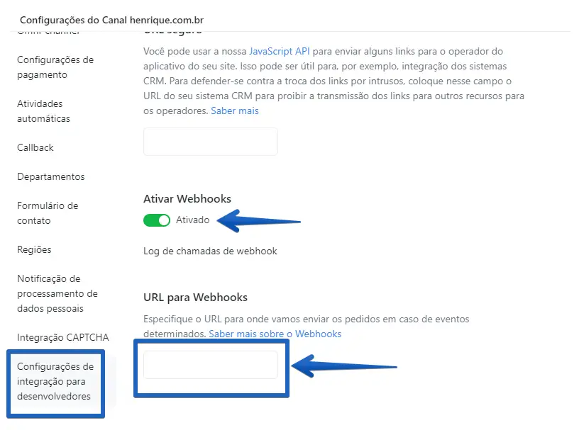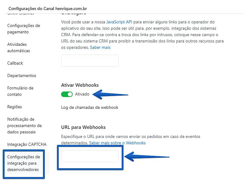 Siga este caminho**:** Configurações > Canais > Configuração do canal > Configurações de integração para desenvolvedores.