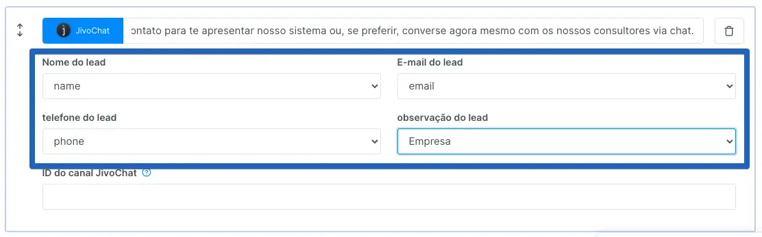 5. Selecione as informações do cliente captadas pela Leadster que gostaria de enviar ao JivoChat. As opções disponíveis são: nome, e-mail, telefone e observação do lead.