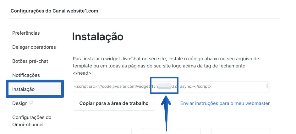 7. Clique em Instalação. Copie o ID do canal do chat localizado dentro do script de instalação do JivoChat, como indicado na imagem abaixo: