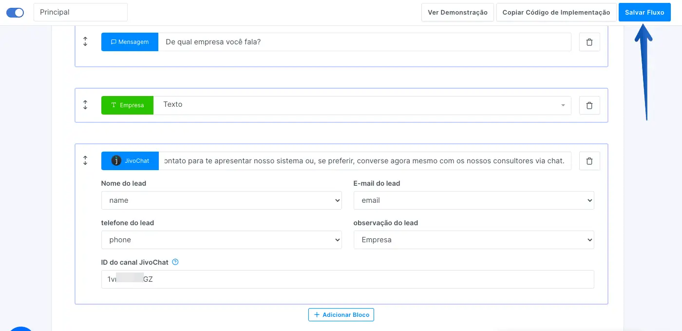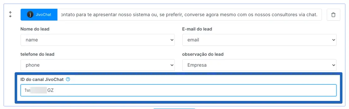 8. Com o ID em mãos, volte para o painel da Leadster e insira seu ID no campo Id do canal JivoChat.