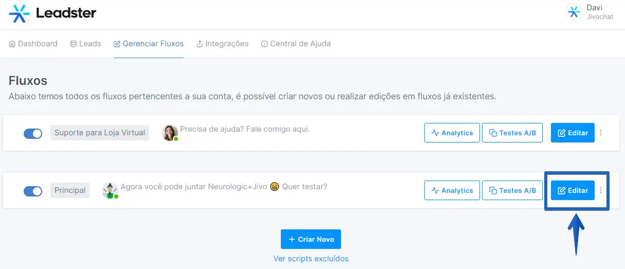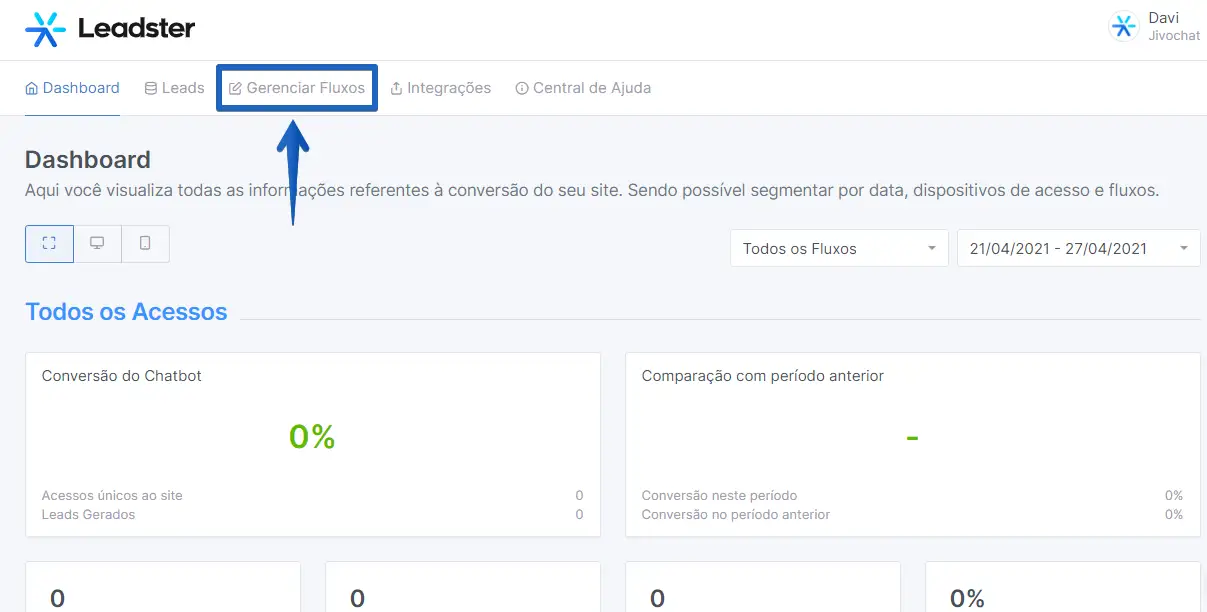 1. Acesse a sua conta da Leadster e clique em Gerenciar Fluxos.