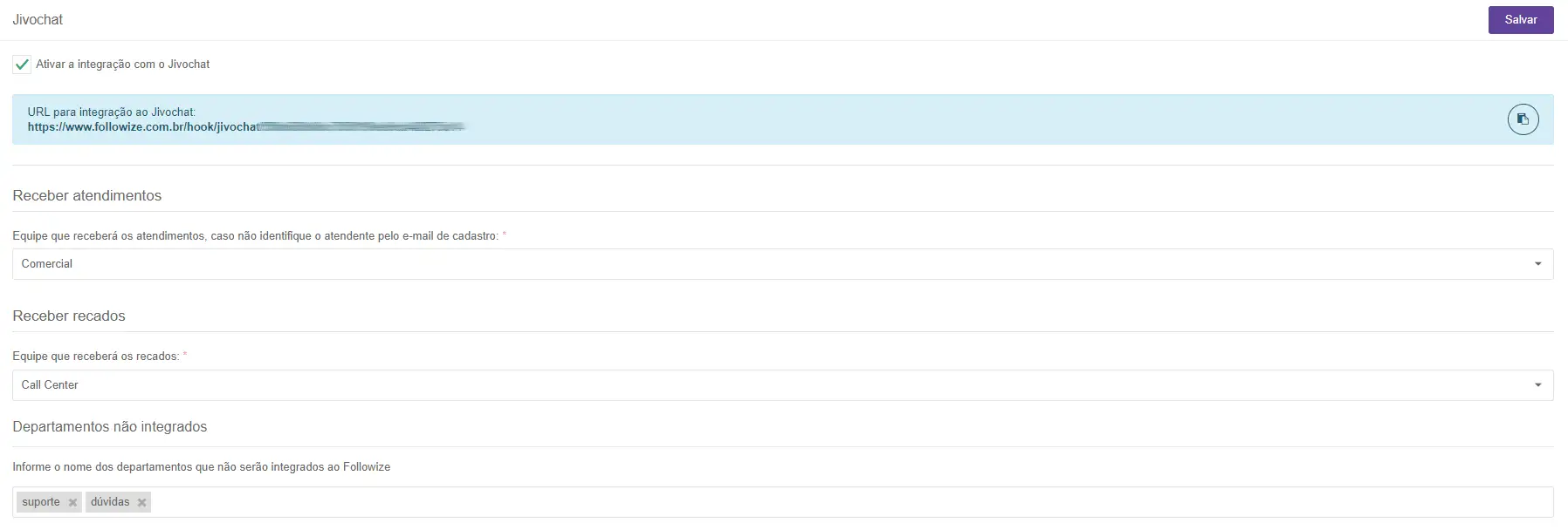 O nome do departamento deverá ser idêntico ao departamento informado no JivoChat. Não utilize o carácter especial "|" no nome do departamento.