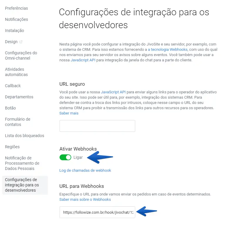 8. Agora, dentro do aplicativo do operador da JivoChat, acesse as Configurações -> Canais -> Configurações (abaixo do nome do canal) -> Configurações de integração para os desenvolvedores, selecione a opção Ativar Webhooks e insira o link gerado pela Followize no campo "URL para Webhooks".