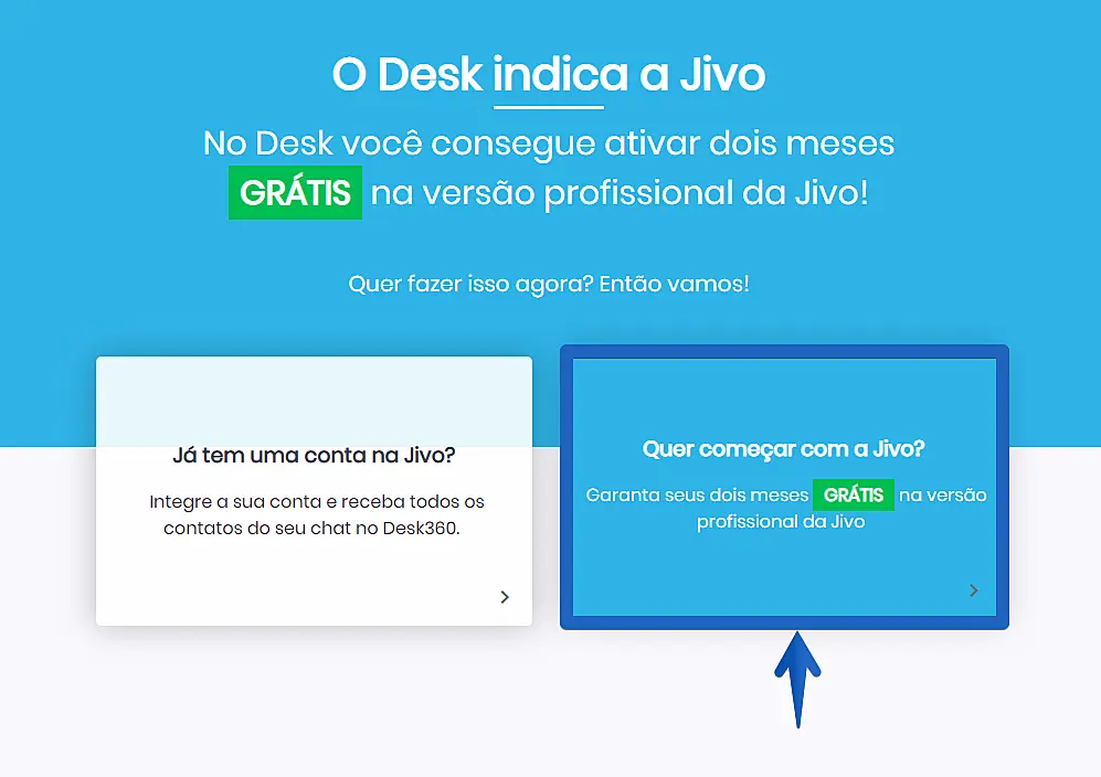 Na próxima tela, você deverá selecionar se já possui uma conta no JivoChat ou se deseja criar uma conta nova.