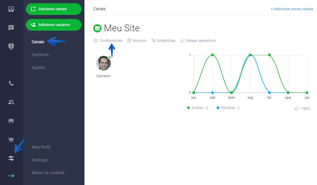 Com o código em mãos, acesse o aplicativo web do JivoChat, ou qualquer um de nossos apps Desktop, e clique em Configurações -> Canais -> Configurações.