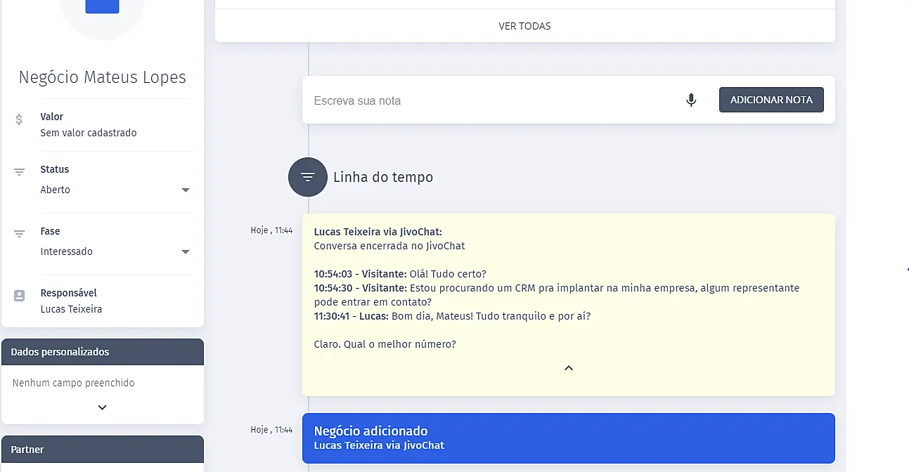 - Todas as conversa realizadas no JivoChat serão gravadas na nota do contato e negócio, caso tenha um aberto (exemplo abaixo).