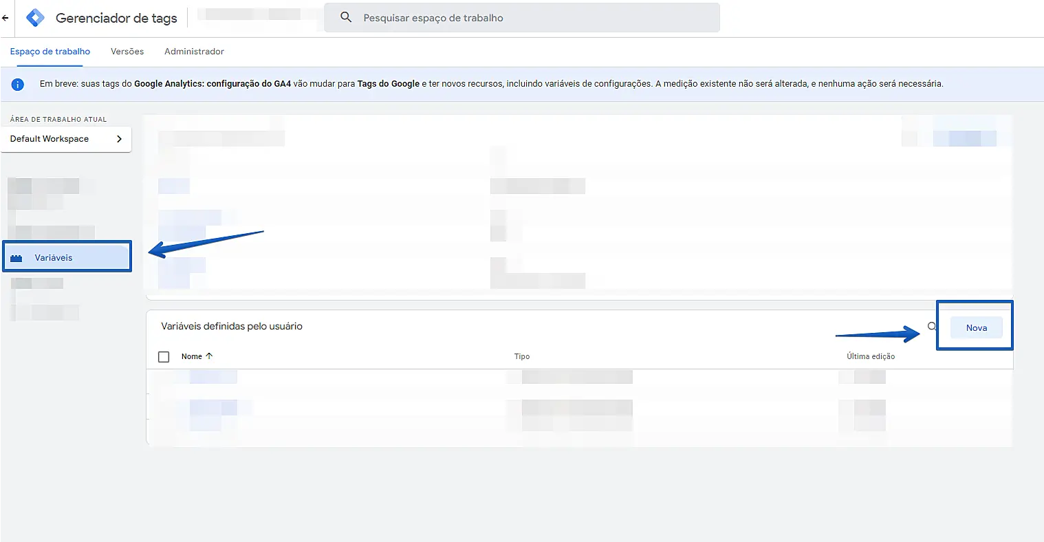 Em seguida, vá em "Variáveis" e clique em "Novo"