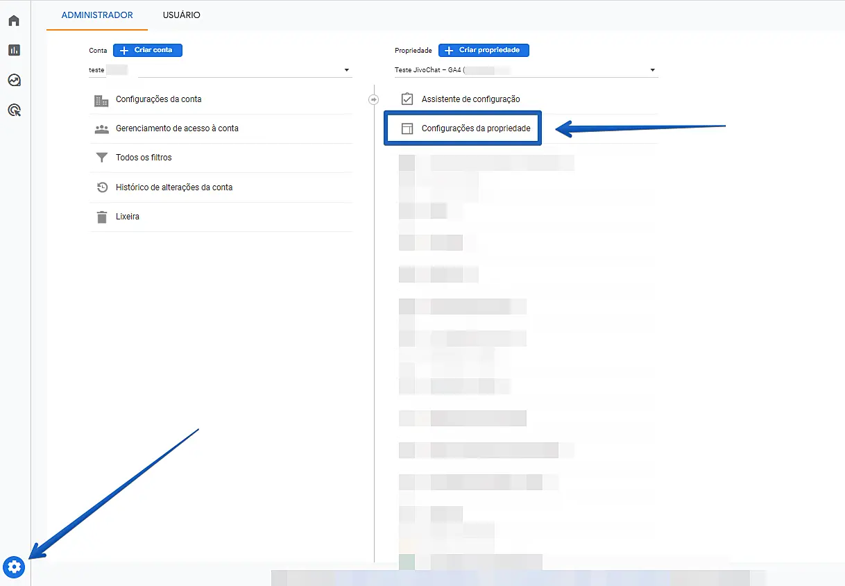 Logue em seu painel do Analytics, clique no símbolo da engrenagem e em seguida. clique em "Configurações da propriedade"