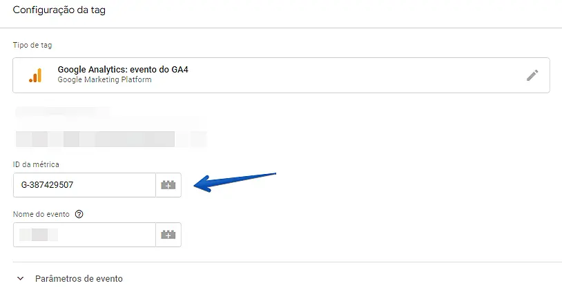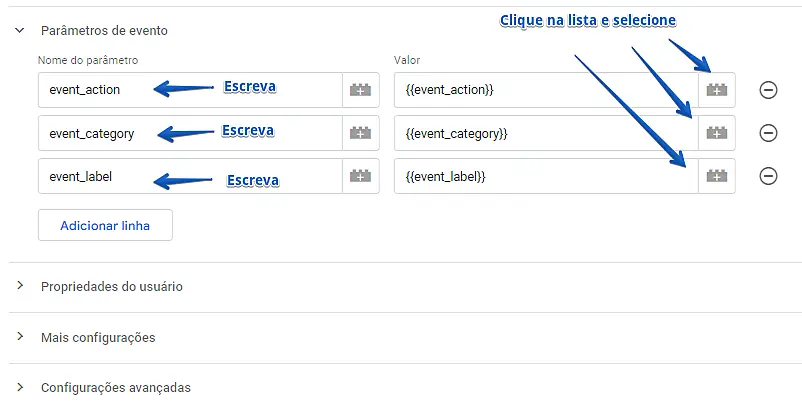 Em "Nome do parâmetro", adicione as três variáveis que você criou anteriormente e em "Valor", clique no menu para que a lista apareça e o evento do mesmo nome possa ser selecionado, para que fique como na imagem a seguir: