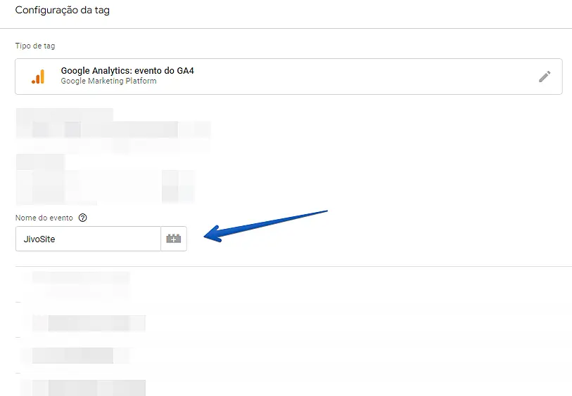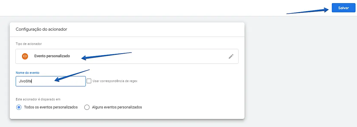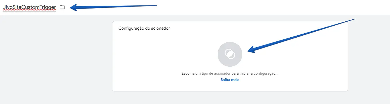 Escreva um nome como "JivoSiteCustomTrigger" e vamos escolher um tipo de gatilho