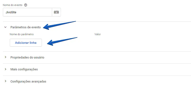 Logo abaixo, clique em "Parâmetros do evento" -> Adicionar linha