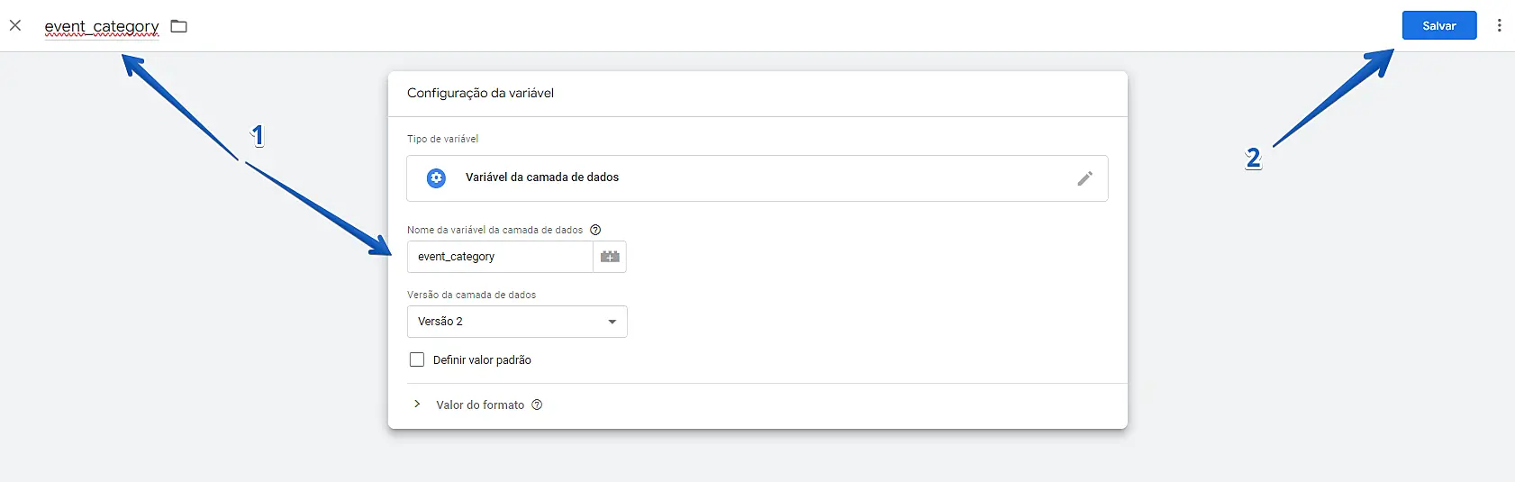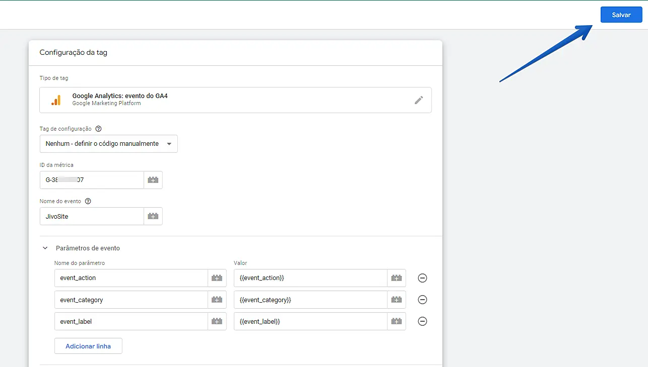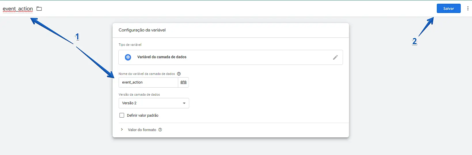 Depois escreva o nome do evento que será o mesmo: event_action e clique em salvar no topo direito: