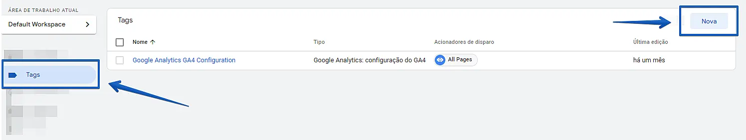 Agora vamos ao menu de Tags -> Clique em "Nova"