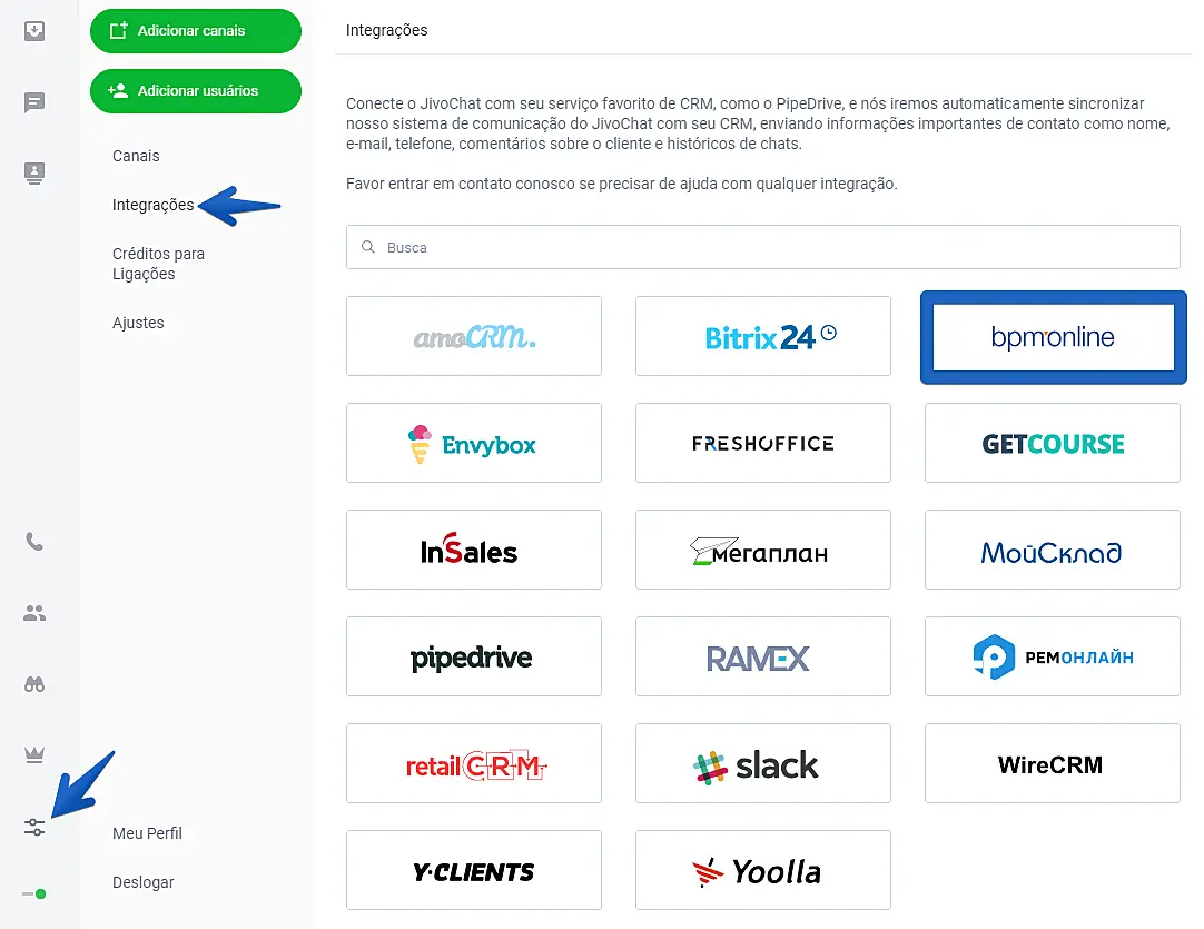 Para integrar o Creatio ao JivoChat, abra o aplicativo web do JivoChat ou o aplicativo para Desktop, acesse as Configurações -> Integrações -> e clique em Creatio.