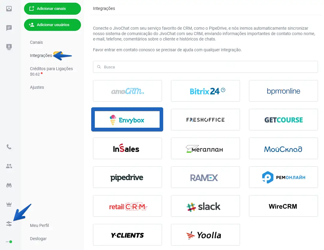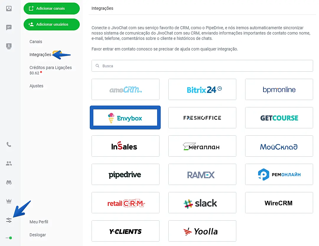 Para integrar o EnvyCRM ao JivoChat, abra o aplicativo web do JivoChat ou o aplicativo para Desktop, acesse as Configurações -> Integrações -> e clique em EnvyCRM.