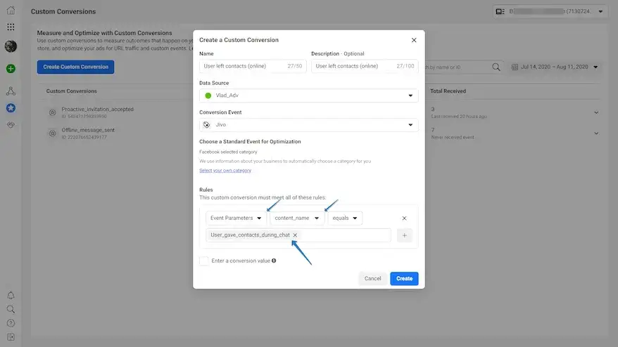 - "Regras": escolha o tipo "Parâmetros do evento", com o parâmetro "content_name" que é "igual" (ou "contém"). Em seguida, cole o valor "User_gave_contacts_during_chat" e selecione-o na dica de digitação que aparece abaixo