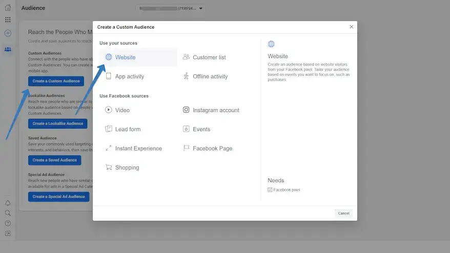 - Clique em "Criar um público personalizado" e selecione "Site" como a fonte: