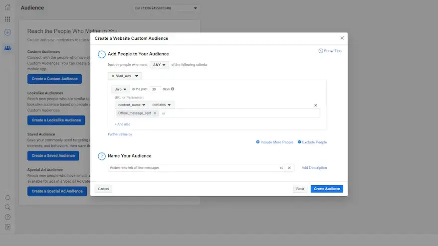 - Crie um novo público personalizado, conforme mostrado na imagem abaixo, usando um (ou mais) eventos da JivoChat:
