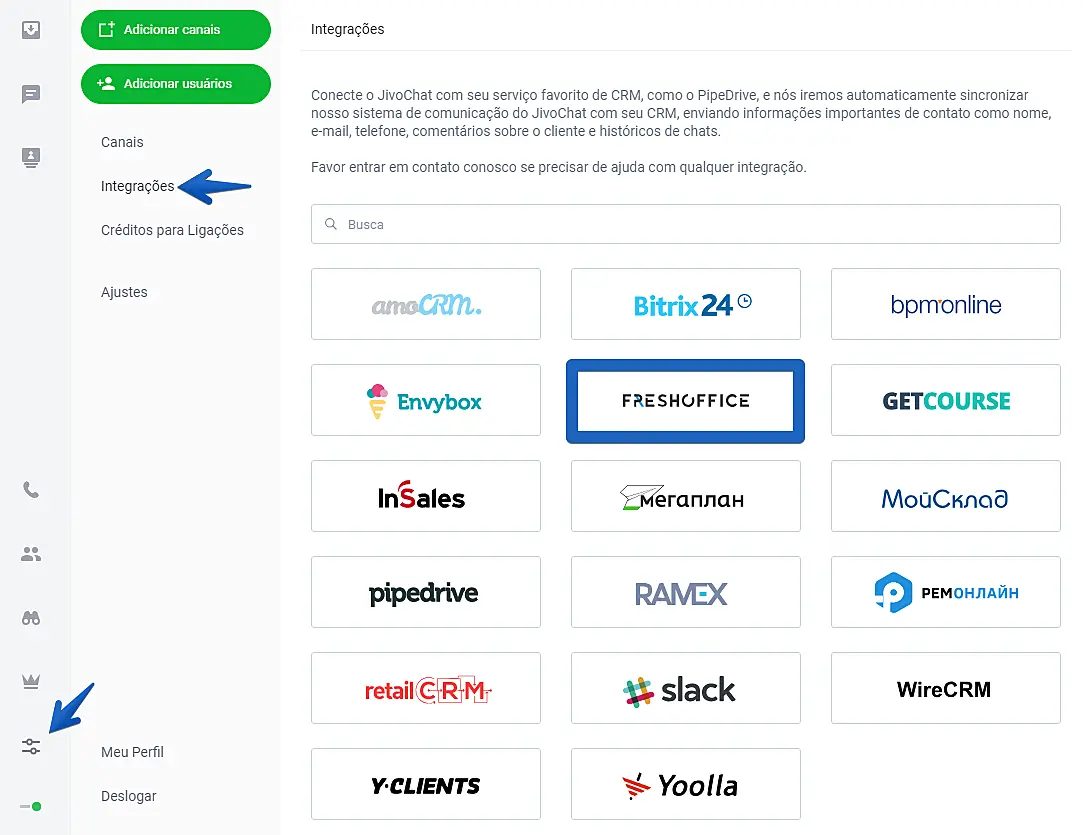 Para integrar o FreshOffice ao JivoChat, abra o aplicativo web do JivoChat ou o aplicativo para Desktop, acesse as Configurações -> Integrações -> e clique em FreshOffice.