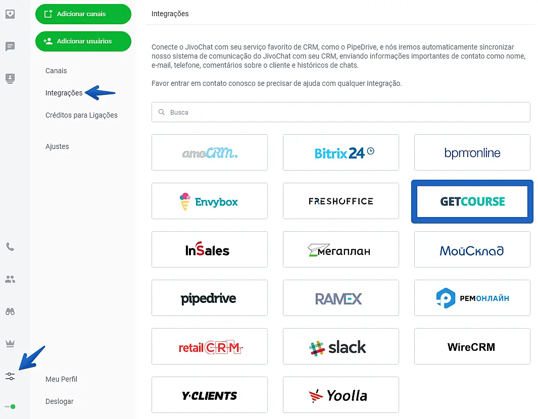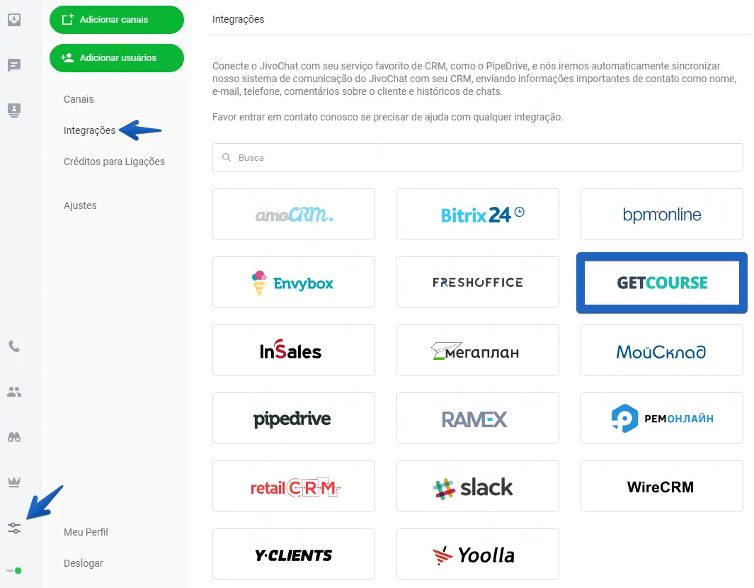 Para integrar o GetCourse ao JivoChat, abra o aplicativo web do JivoChat ou o aplicativo para Desktop, acesse as Configurações -> Integrações -> e clique em GetCourse.