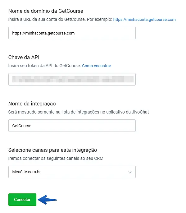 2.Chave da API: Para acessar a página contendo sua chave da API, crie manualmente um link como este aqui - http://testejivo.getcourse.com/saas/account/api. Substitua o testejivo.getcourse.com pelo seu nome de domínio do GetCourse, copie e cole o link gerado no seu navegador e acesse a página. Depois, gere sua chave clicando no botão indicado e insira-a aqui neste campo.