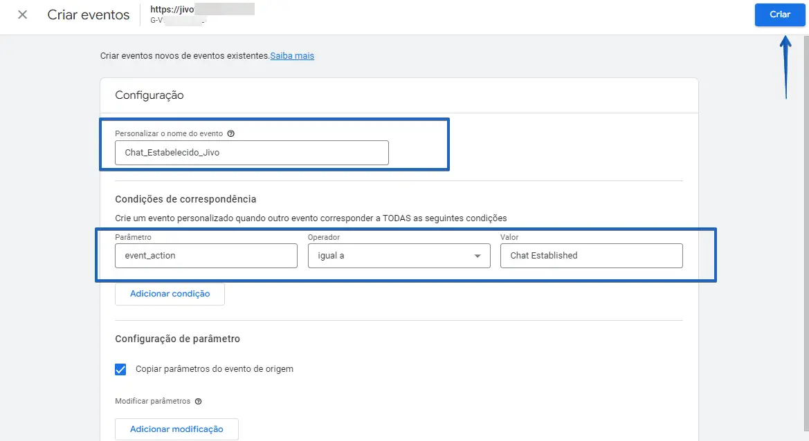 - Personalizar nome do evento: você pode escrever de acordo com o evento a ser mapeado, por exemplo: "Chat_Estabelecido_JivoChat"