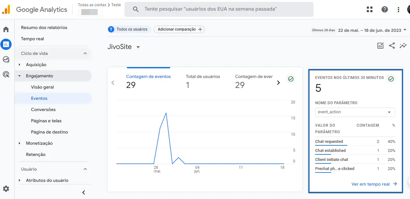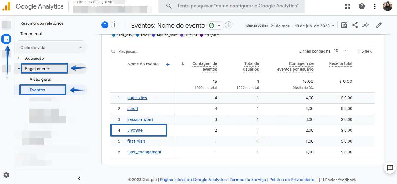 - Vá para a guia "Relatórios" → "Engajamento" → "Eventos".