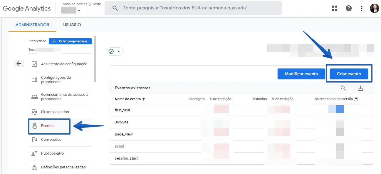 Nota: o evento personalizado pode levar até 48h para ser registrado em no painel de "Eventos existentes".
