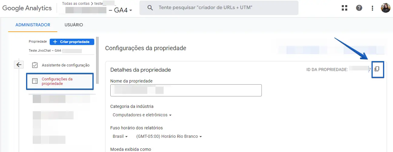 Para a opção "Google Analytics: configuração do GA4", retorne ao painel do Analytics -> Clique em "Configurações da propriedade" -> Copie o ID da métrica