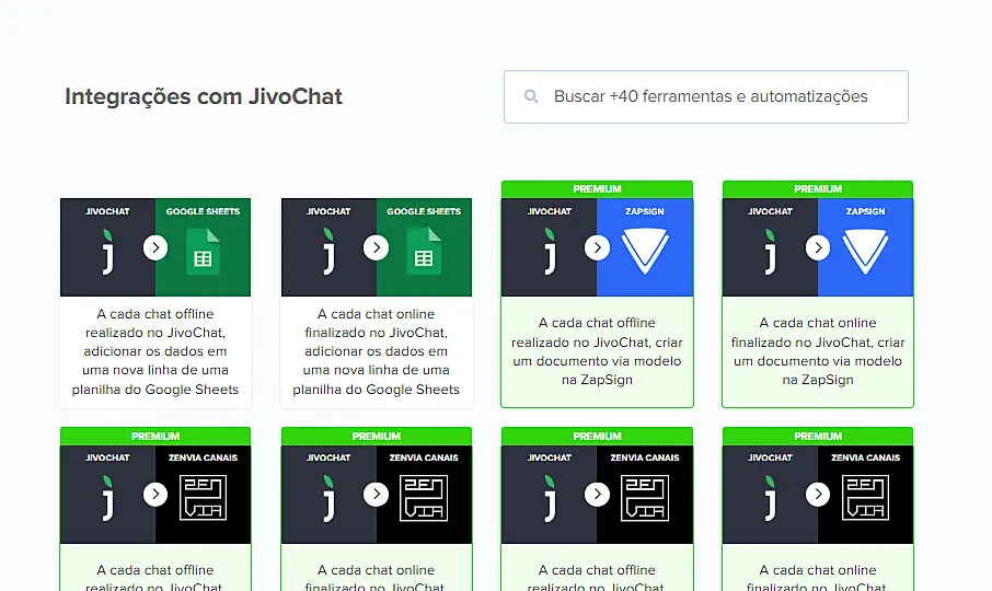 1. Acesse a página do Jivochat dentro da Pluga e escolha a ferramenta que deseja integrar com o Jivochat