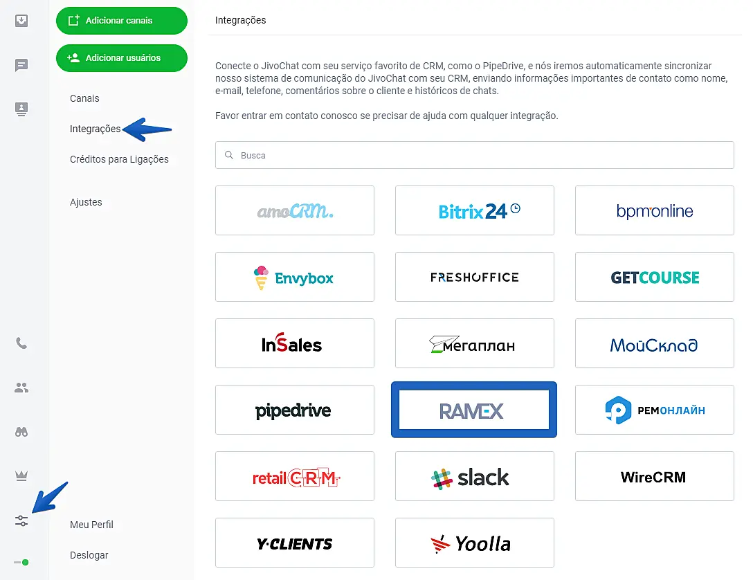 Para integrar o Ramex CRM ao JivoChat, abra o aplicativo web do JivoChat ou o aplicativo para Desktop, acesse as Configurações -> Integrações -> e clique em Ramex.