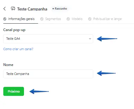 Escolha o canal, insira o nome da campanha e avance para "Próximo".