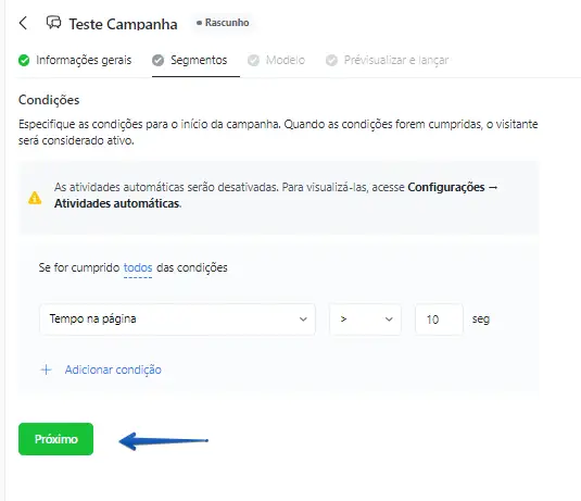Nota: Ao ativar uma campanha, todas as suas mensagens de atividades automáticas serão desativadas automaticamente.*