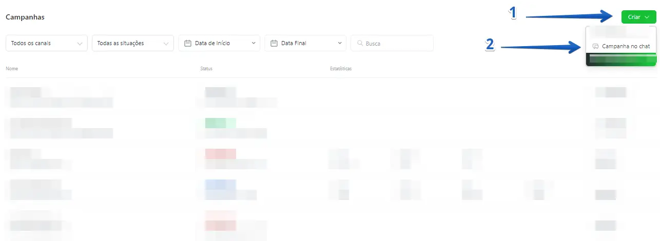 Neste menu você pode clicar em "Criar" e selecione o tipo de "Campanha de Chat"