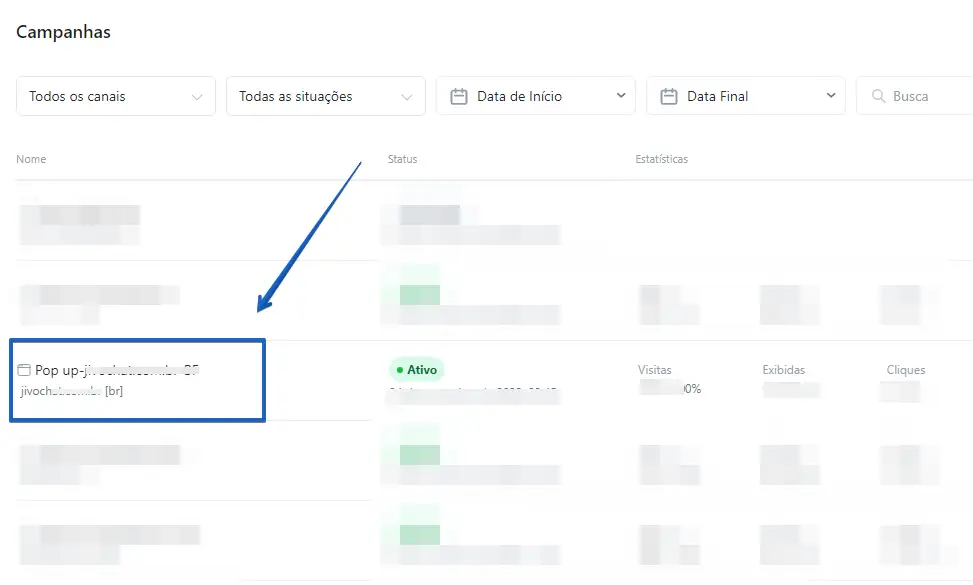 Para verificar estatísticas de suas campanhas, vá para o menu de campanhas de marketing onde verá todas as suas campanhas. Clique no nome da campanha que deseja verificar.