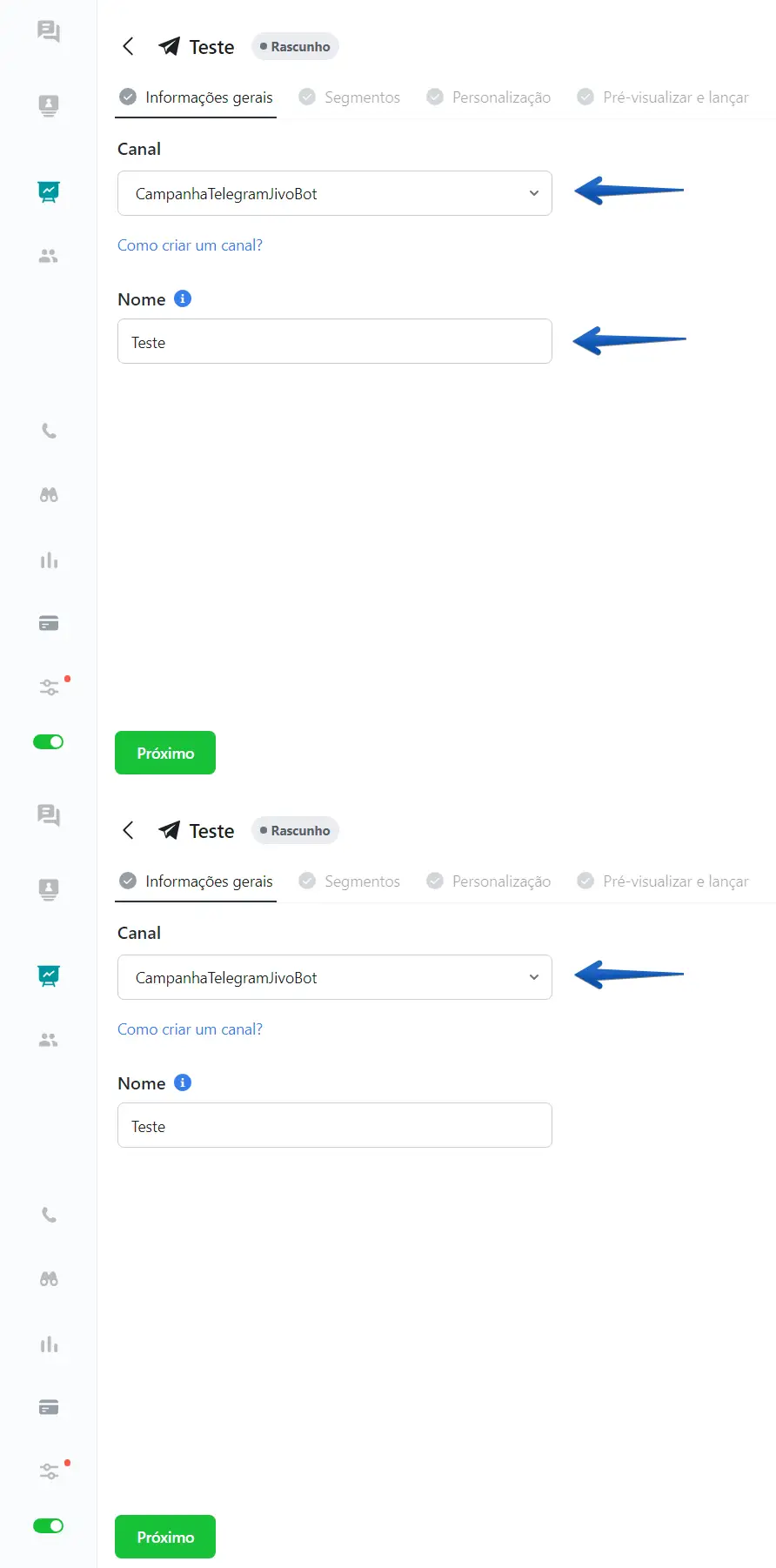 Importante: A campanha só pode ser enviada para clientes que já estão no CRM no aplicativo Jivo. Isso significa que eles já entraram em contato com você por meio de um bot conectado ao Jivo.