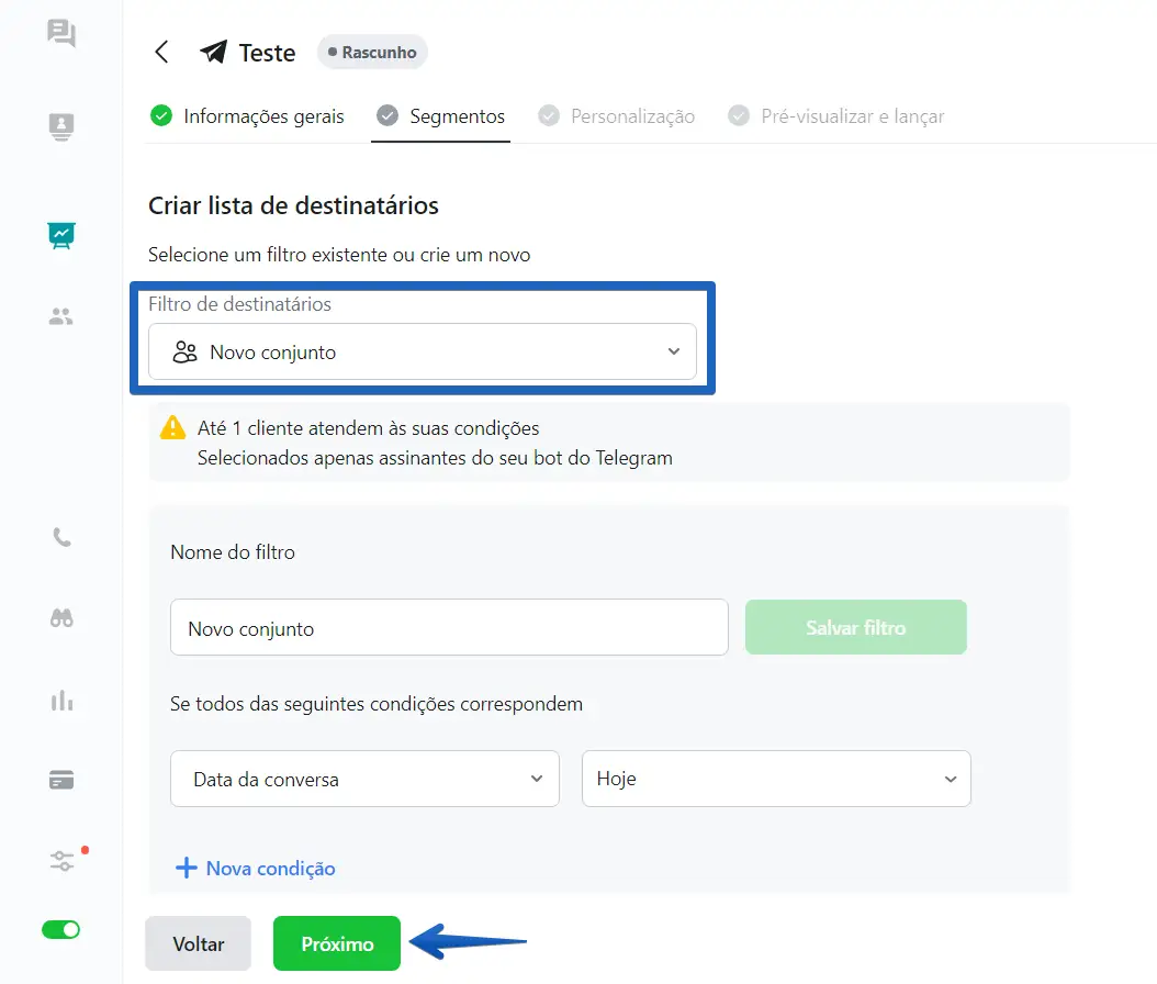 O template será enviado para todos que atendam aos critérios. Ao selecionar um filtro existente ou clicar em "Salvar filtro" para novos parâmetros, você verá o número de clientes correspondentes.