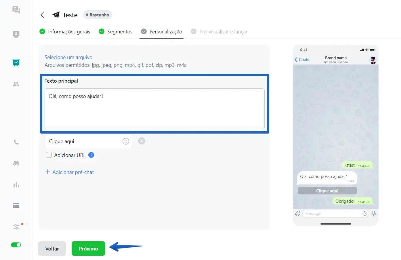 Depois de personalizar, clique em "Próximo". Agora você seguirá para a última etapa - "Pré-visualização e Lançamento".