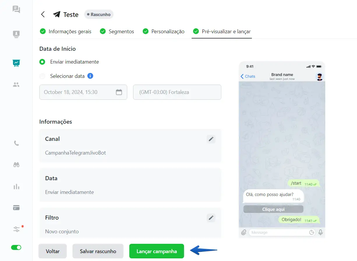 Para iniciar uma campanha, você deve ter um canal de comunicação do Telegram conectado à sua conta do JivoChat. Basta seguir estas instruções para conectá-lo: Clique aqui