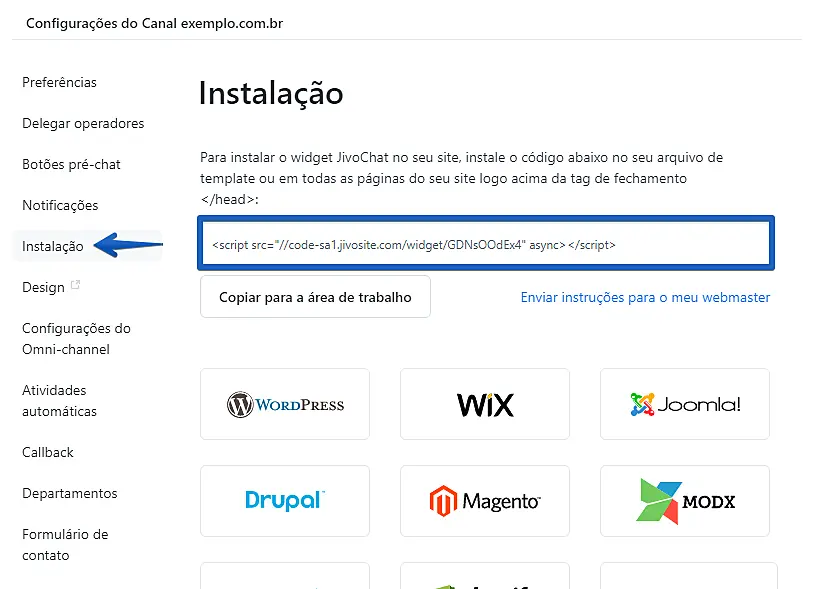 Aqui você pode visualizar o código de instalação do chat, o qual deverá inserir no rodapé do seu site ou instalar seguindo um de nossos tutoriais de instalação, e também pode clicar para enviar o código para seu webmaster realizar a instalação para você.