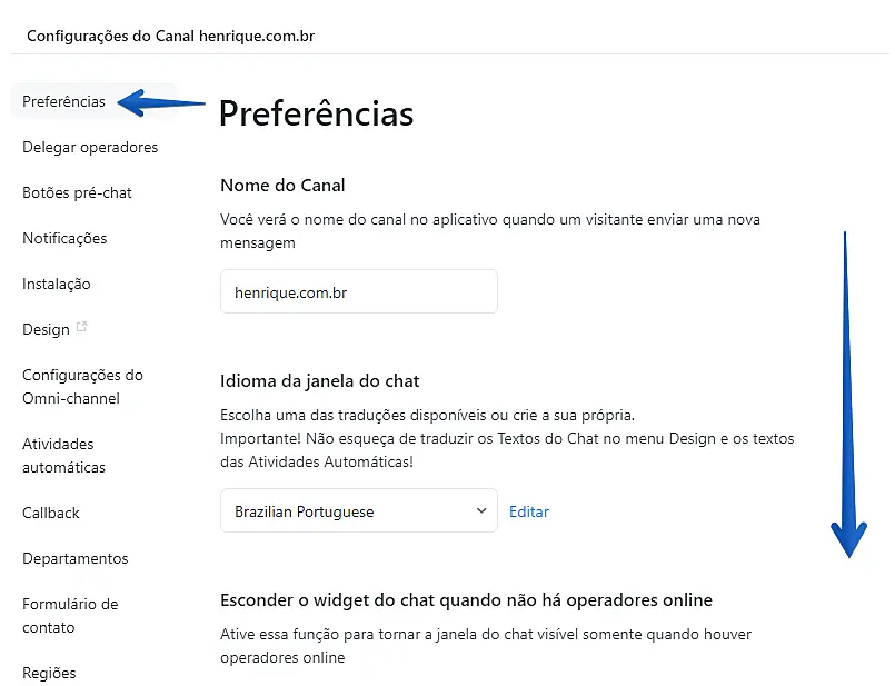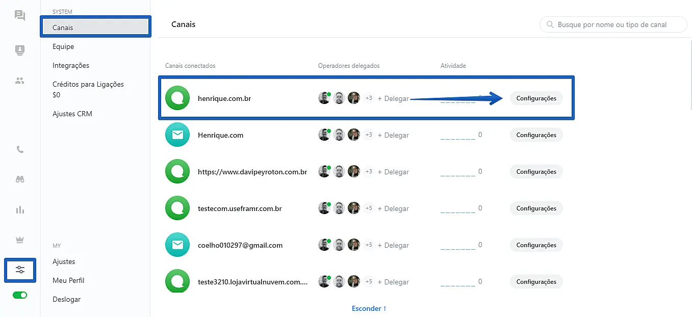 Em seguida, clique no botão "Configurações" localizado no canto esquerdo inferior. No menu que você verá, clique em "Canais", localize "Chat Online" e clique em "Conectar"