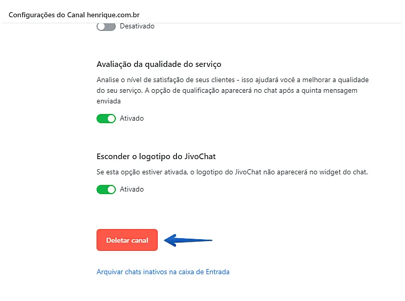 Se você deseja excluir um site ou qualquer outro canal, você pode ir em "Configurações" > "Canais" > "Configurações" do canal, conforme mostrado na imagem abaixo: